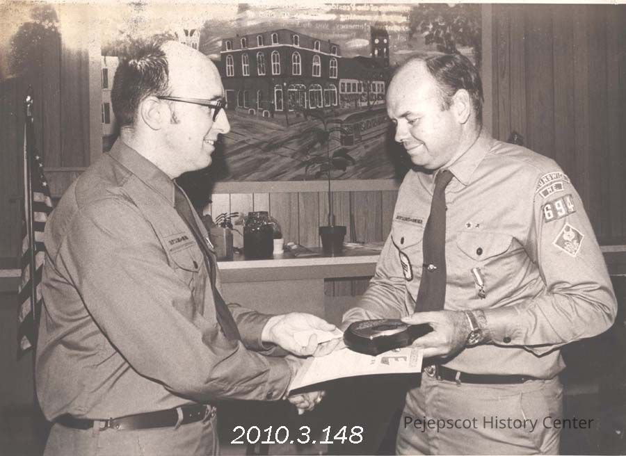 A B/W photograph of retiring Cubmaster Richard Nickerson receiving an award from Roger Deveau District Scout Chairman. Photo published 5/23/1973. Undated