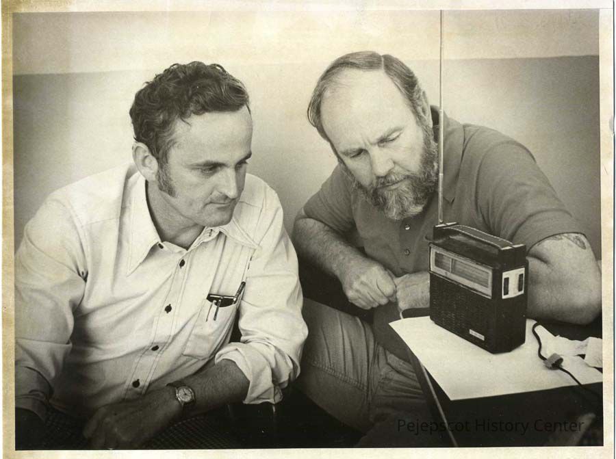 A black and white photo Topsham selectmen Richard F. Snow, left, and C. William Pettigrew was published in The Times Record in Brunswick, Maine, on 7/12/1979.