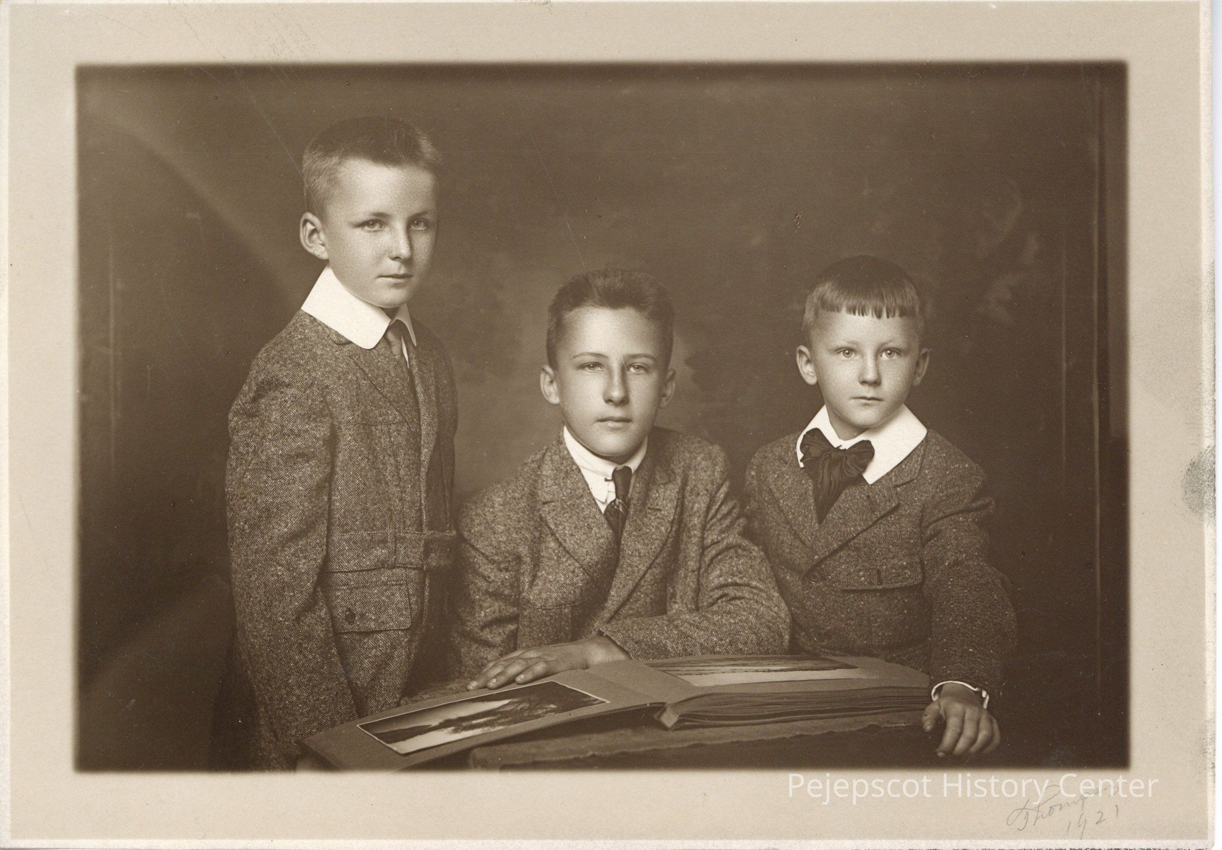 Formal studio portrait of three boys. They are posed looking at a photo album. Left to right, they are identified as Richard Dennison Wells, Stanley Chandler Wells, and Arthur Edward Wells Jr, the sons of Charlotte Chandler Wells.Lexicon