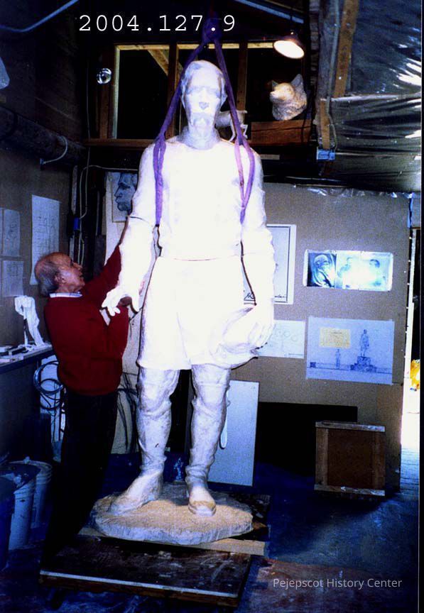 A color photograph of the J.L. Chamberlain statue (clay?) being rigged with ropes. J. Query is adjusting the ropes. 09/05/2002