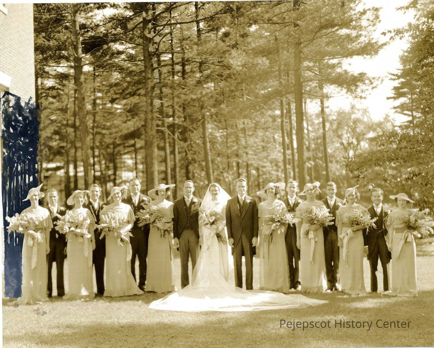 The wedding party of the Lydia Riley and Harrison Davis wedding standing in the Bowdoin Pines. Undated