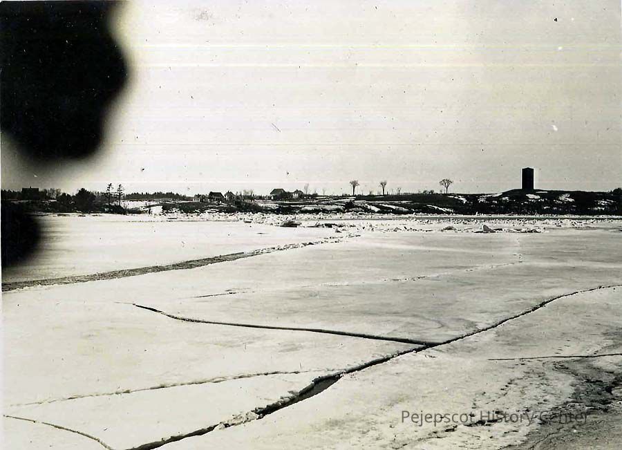 A B/W photograph showing ice sheets in the Androscoggin River during the 1936 flood.