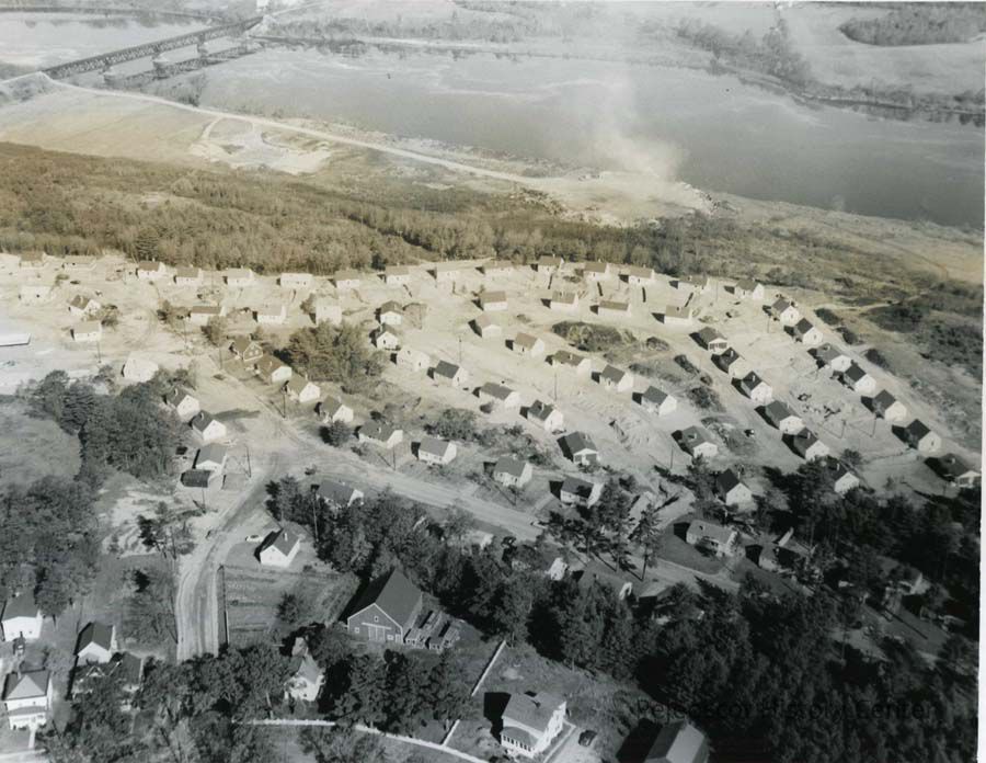 A B/W photograph of Riverview Housing Development off Jordan Avenue. The Old Town Dump is in the background at the end of Water Street. Undated