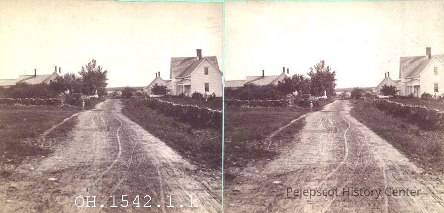 A B/W stereo view of a dirt road in Harpswell, ME. Undated