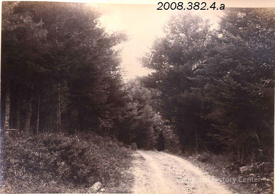 A B/W photograph of a road on Great Island. It shows some trees and a dirt road. Undated