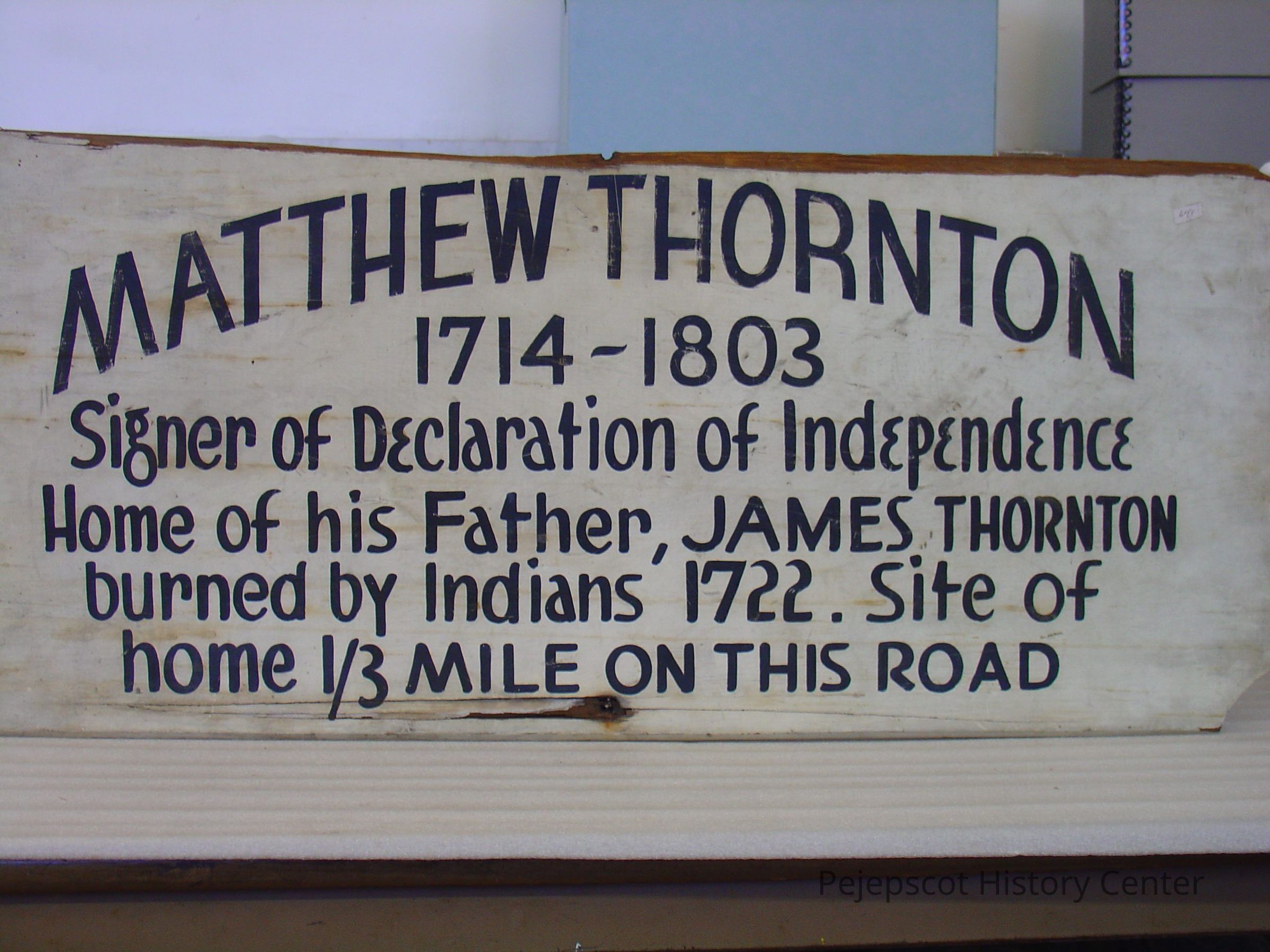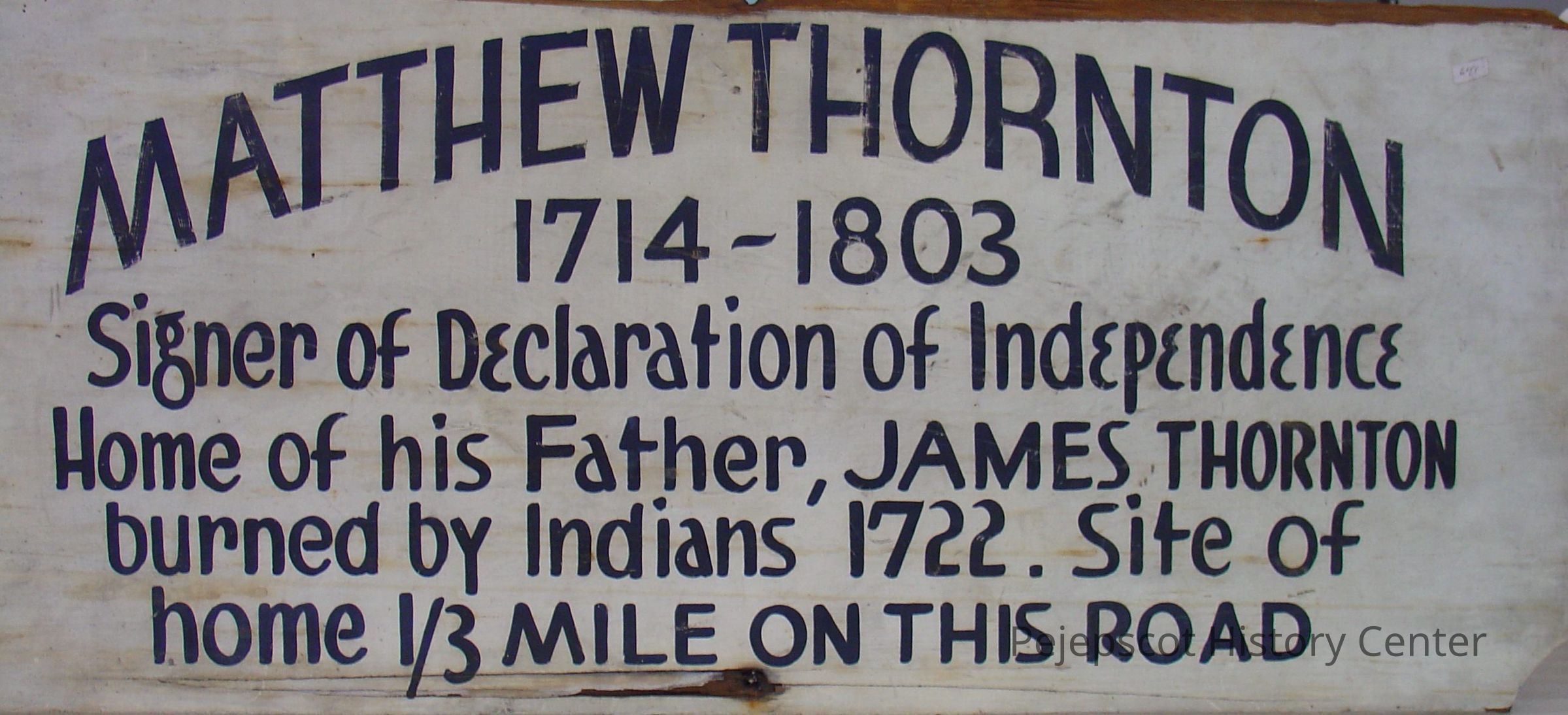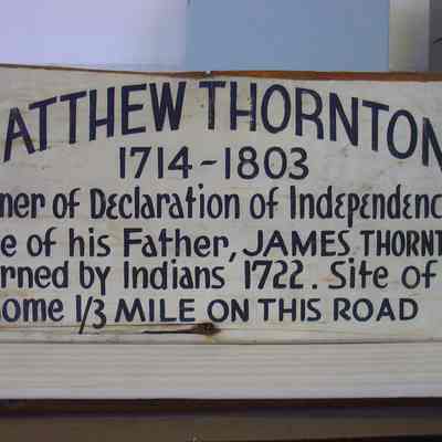 White wooden sign with hand painted black lettering reading “MATTHEW THORNTON/ 1714-1803/ Signer of Declaration of Independence/ Home of his Father, JAMES THORNTON/ burned by Indians 1722. Site of/ home 1/3 MILE ON THIS ROAD.”
