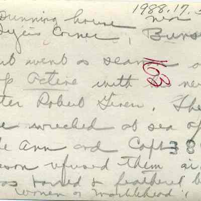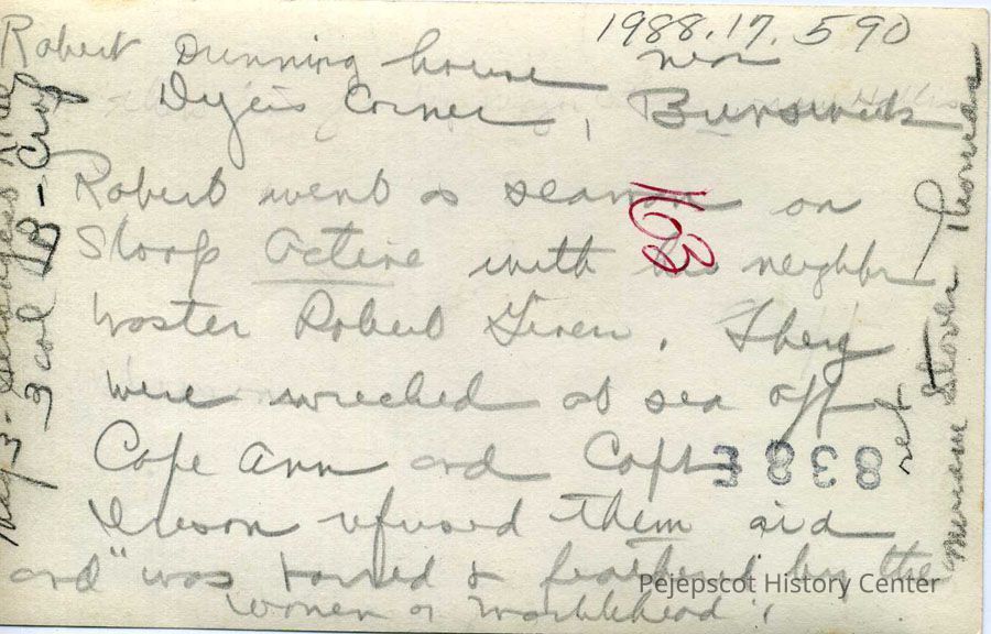 An undated black and white photograph of the Robert Dunning house near Dyer's Corner, Brunswick. Written on the back by Miriam Stover Thomas is the following: "Robert went as seaman on the sloop, Active, with his neighbor, Master Robert Given. They were wrecked at sea off Cape Ann and Capt. ? refused them aid and was tarred and feathered by the women of Marblehead."Collection