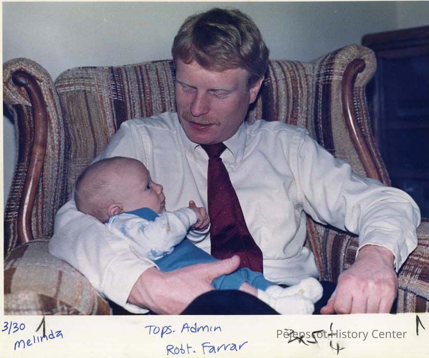 An undated color photo of Robert Farrar, Topsham, Maine, town administrator holding baby Melinda.