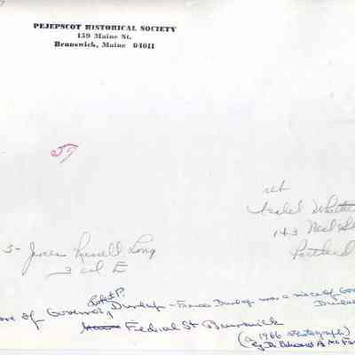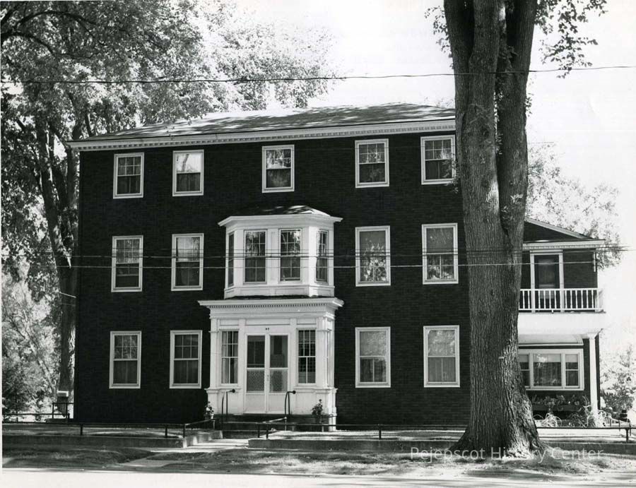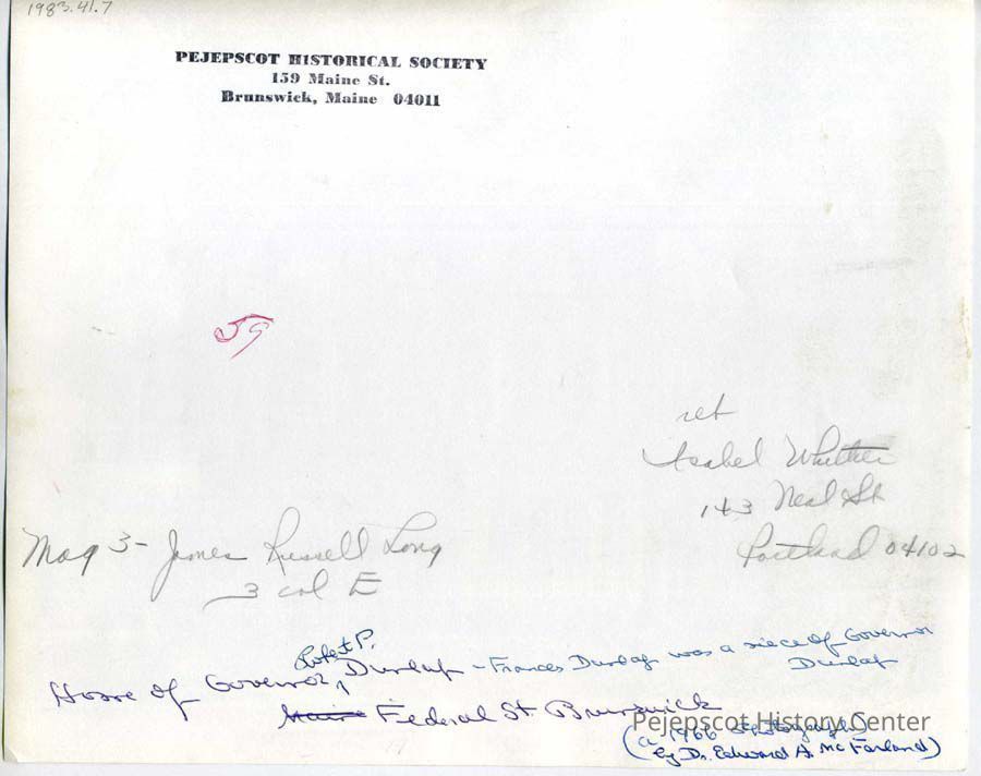 A B/W photograph of the Robert P. Dunlap House at 27 Federal Street. Frances Dunlap was a niece of Governor Dunlap. A 1966 photograph by Dr. Edward A McFarland.