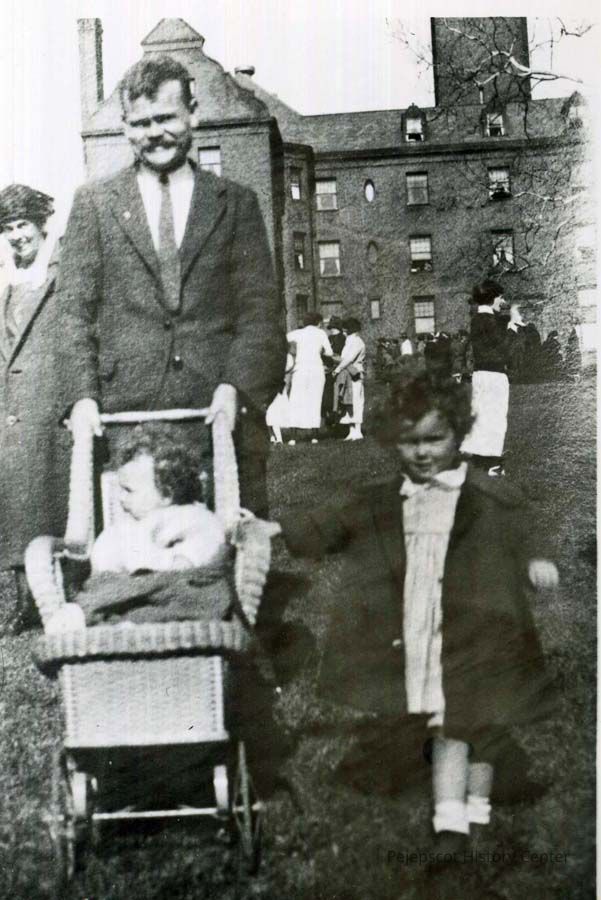 B/W photo of writer Robert P. T. Coffin with his children on the campus of Wells College, Aurora, NY. No date.