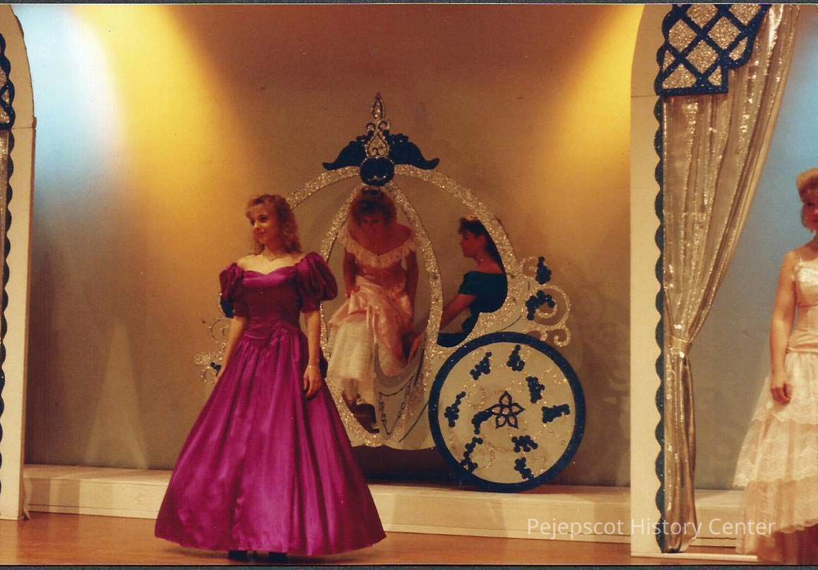 A color photograph of Robin Moody leaving the coach with Stacy Bean ready to leave for gown competition and Corrie Pottle ready.
