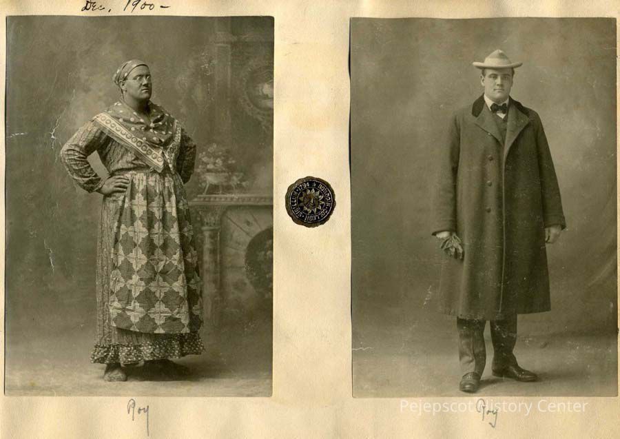 A B/W double portrait of Royal Rodnell, Bowdoin Class of 1901, in theater costumes. On the left, Rodnell appears in blackface, portraying a racist "mammy" or "Aunt Jemima" caricature. These caricatures were commonly portrayed in white theaters. Undated.