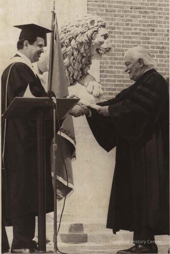 A black and white photo of Bowdoin College President Dr. Roger Howell Jr. presenting an honorary degree to conductor Arthur Fiedler in 1973.The photo was published in The Times Record in Brunswick, Maine, on 7/10/1979, the day Fiedler died.