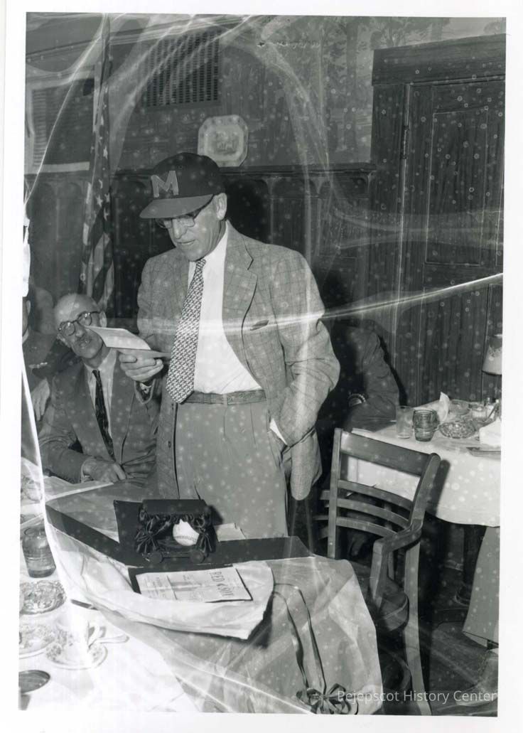 Edgar E. Comee speaks to the Rotary Club while Pat Sawyer listens.