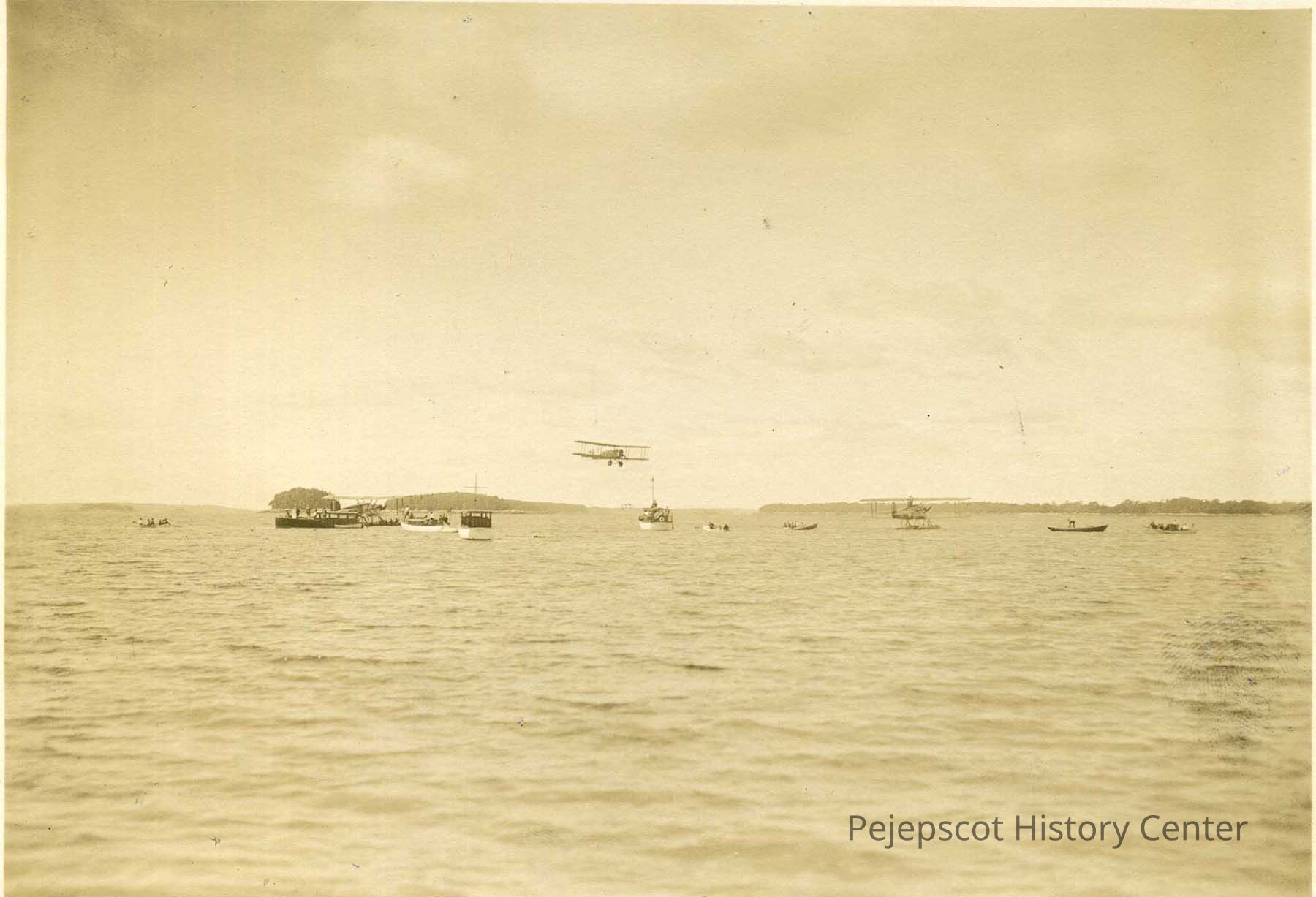 A sepia toned photo of the Round the World Flyers at Mere Point. Here, Col. Patrick's plane salutes the Chicago and Boston II. Seven boats are in the water.