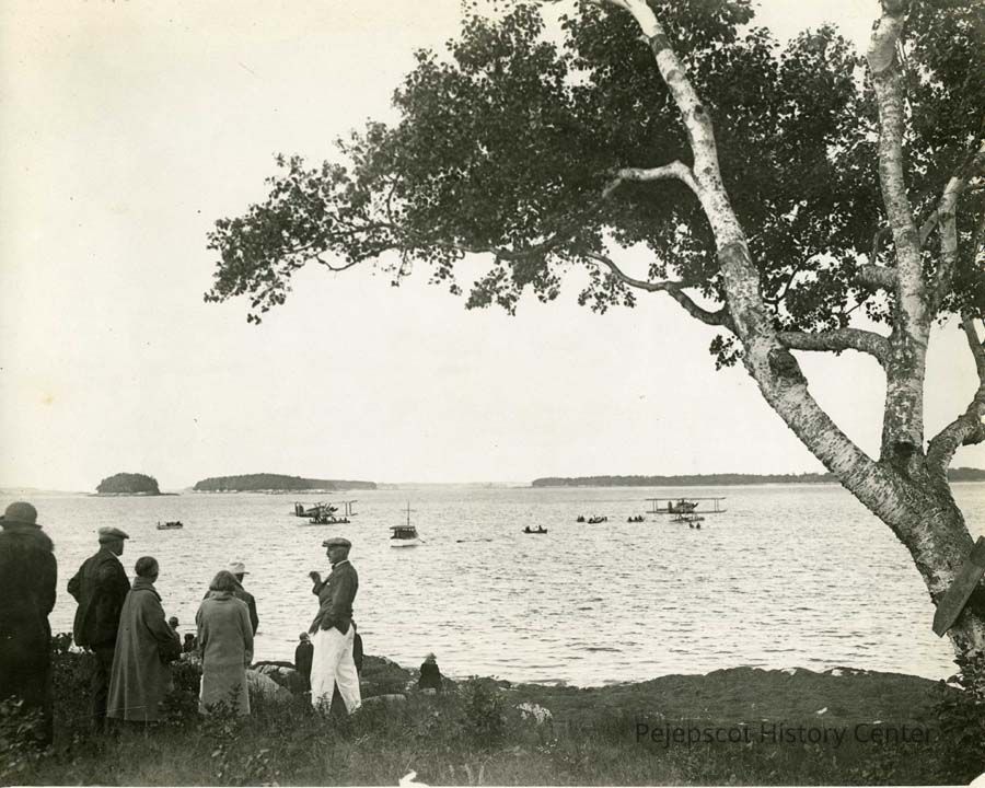 Photo of group looking at "Round the World Flyers" from the Stetson property, Mere Point, Brunswick, Maine, 1924. Sea planes "Chicago" and "Boston II". See the commemorative monument at Mere Point, shown on record 1992.40.36b.Lexicon