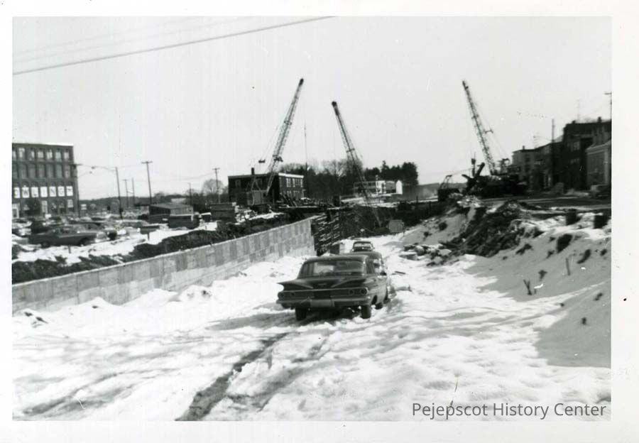 B/W photo of the Route 1 bypass underpass construction along Mill Street, March 1, 1961, after a snowstorm.
