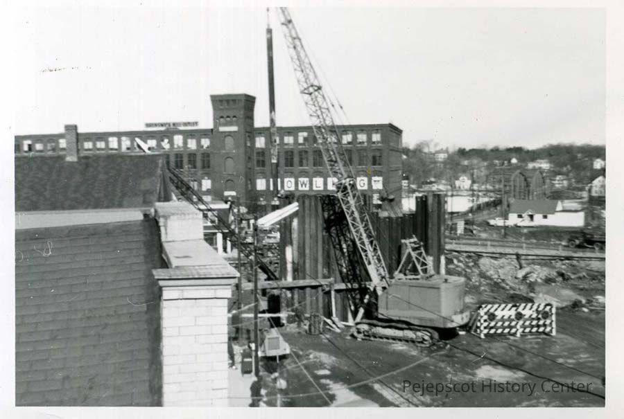 B/W photo of the Route 1 bypass construction site from the roof of the Pennell Block on Maine Street.