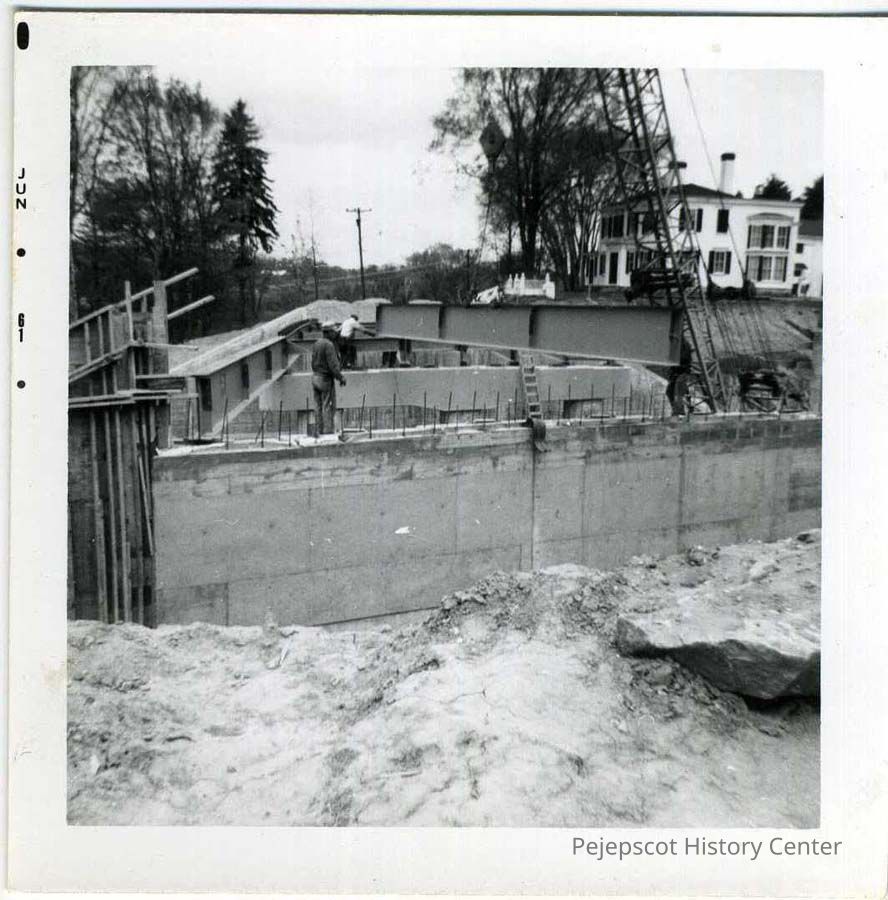 Black and white photograph of the Route 1 underpass, Brunswick, Maine under construction. This view looks north. The Narcissi Stone House, 10 Water Street, Brunswick, Maine is visible in the background. Dated 1961.Lexicon