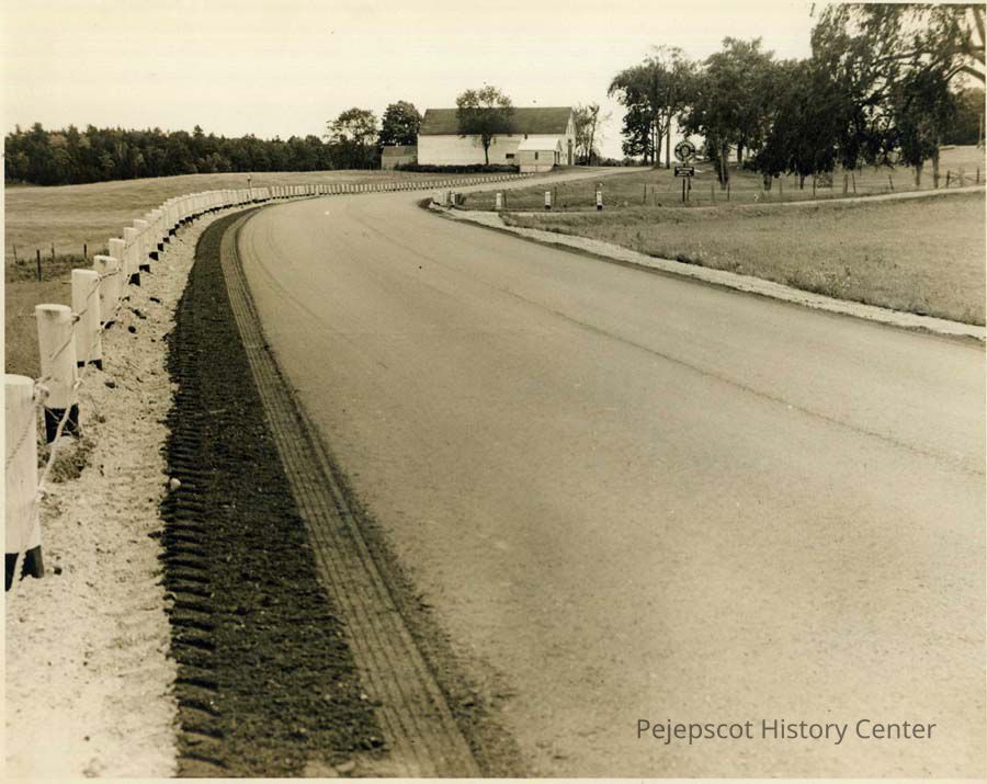 A B/W photograph of Route 201, Augusta Road, Topsham. The barn is opposite the house owned by Jerome Brannigan. Undated