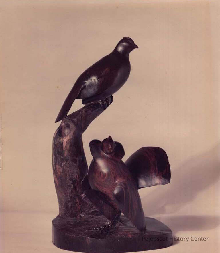 A color photograph of a sculpture of a Ruffled Grouse, (Bonasa umbellus). It is 24 inches high. .It was carved by Charles G. (Chippy) Chase. No. 305. Undated