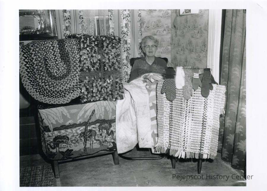 B/W photo of Mrs. Henry Morin, Sr. shown with a braided rug, hooked rug of tropical scene, a rug of cut wool strips, string rugs, and mittens all Christmas gifts for her children (Dec. 1956).Lexicon