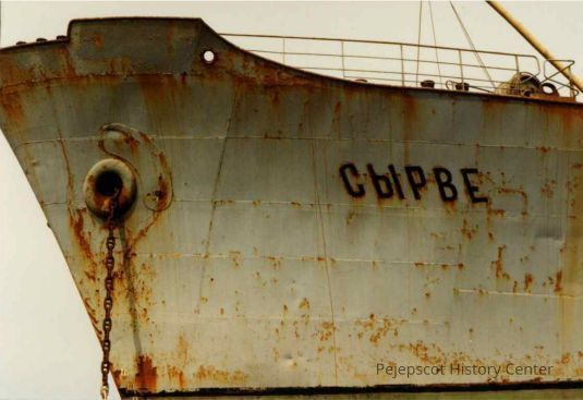A photo of the front of a Russian ship off the coast of Harpswell in 1988. The ship is likely a processing ship, where workers would process fish into fishmeal. The ship has Cyrillic text on the side. The side of the ship is rusted and has an anchor chain coming out of it.Collection