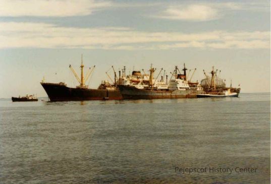 A photo of Russian ships off the coast of Harpswell. The ships are likely processing ships, where workers would process fish into fishmeal. The ships have Cyrillic text on the side. A USSR hammer and sickle insignia is visible on the larger boats. There are 2 smaller ships and either 2 or 3 larger ships, though it is difficult to tell with the detail of the photo. No people are visible on board the ships.Collection