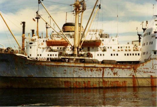 A photo of Russian ships off the coast of Harpswell. The ships are likely processing ships, where workers would process fish into fishmeal. The ship has Cyrillic text on the side. A USSR hammer and sickle insignia is visible on the boat in the back. The side of the ship in the front is rusted and dirty. No people are visible on board the ships.Collection