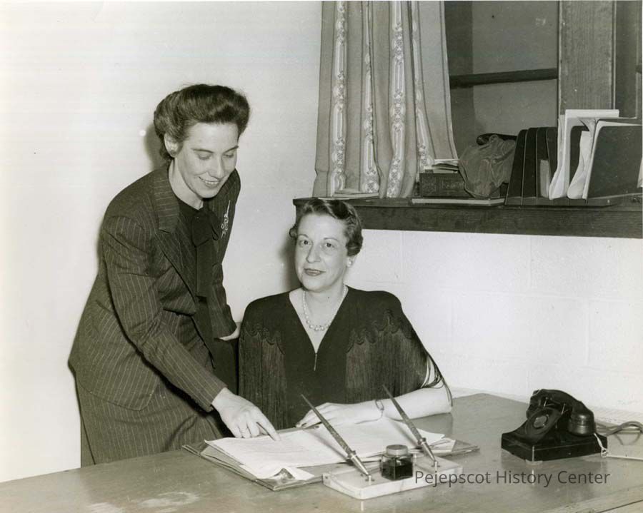 A B/W photograph of Ruth Bangs and Liz Pullen in an office. Undated