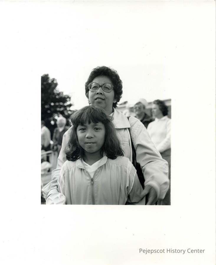 A black and white photograph of Ruth Caouette and her daughter at the Brunswick 250th Parade in Brunswick, ME.