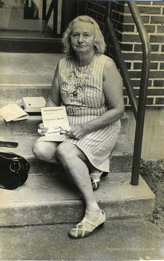 A black and white photo Ruth Hall of Topsham was taken outside a Brunswick courtroom where she was fighting her summons for swimming at Coffin Pond in Brunswick without paying the annual fee. She argued that the fee should be dropped. The photo was published in The Times Record in Brunswick, Maine, on 8/3/1972.