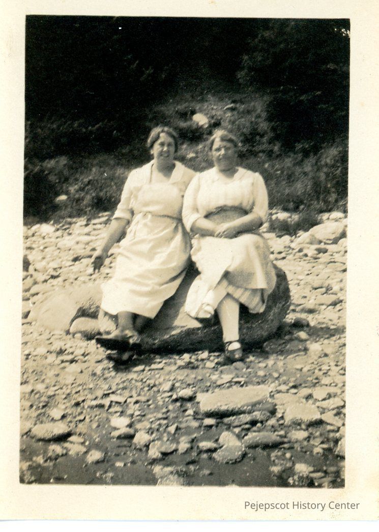 A 2" x3"sepia-toned photograph of two women sitting on a boulder on a rock-strewn ground.