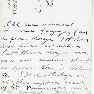 All as usual it was foggy for a few days [?] have had fine weather last three days we are on same street as before. this is looking No. L.W. Coolidge is at the upper end of St. Remember me to Beulah F.B.M.