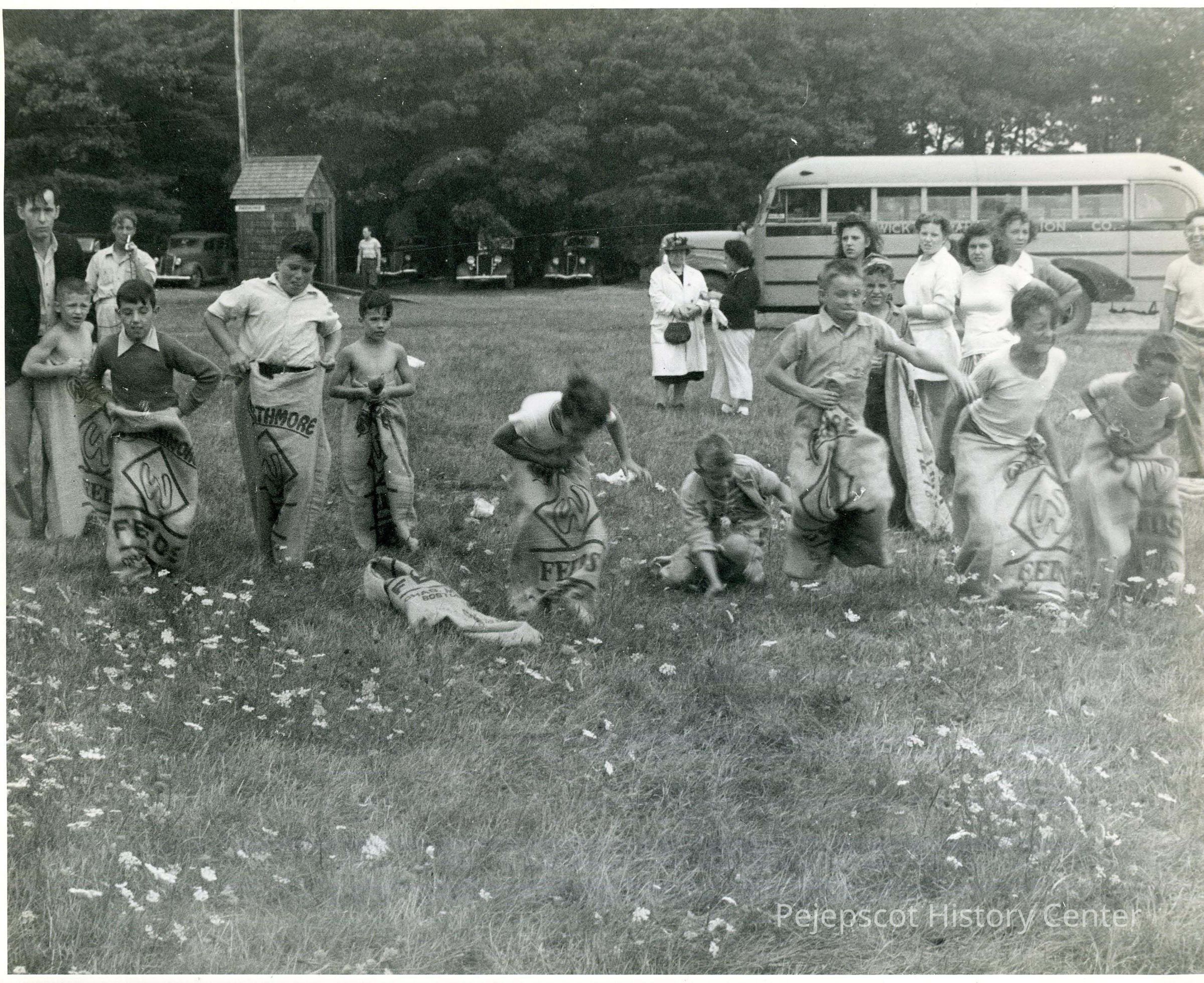 A B/W photograph of the sack race at the Verney Mill picnic, Thomas Point Beach. Undated
