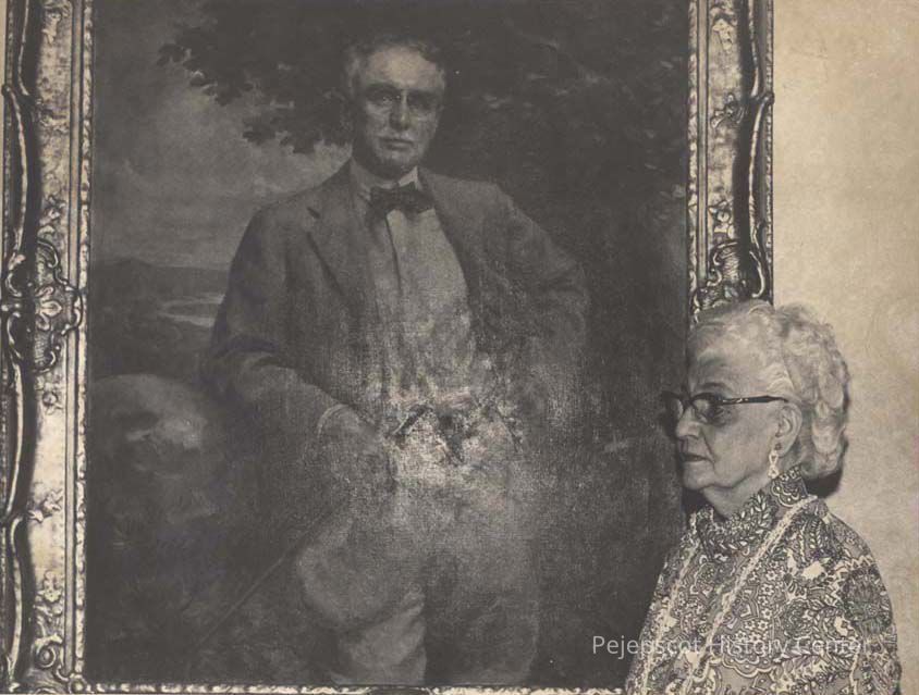 She is standing in front of a painting of Thomas G. Plant, who founded the home for senior citizens.