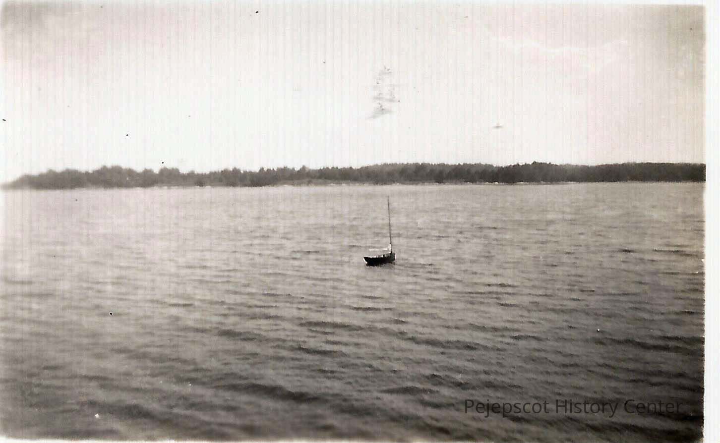 A B/W photograph of a sailboat anchored in the Androscoggin River. Undated