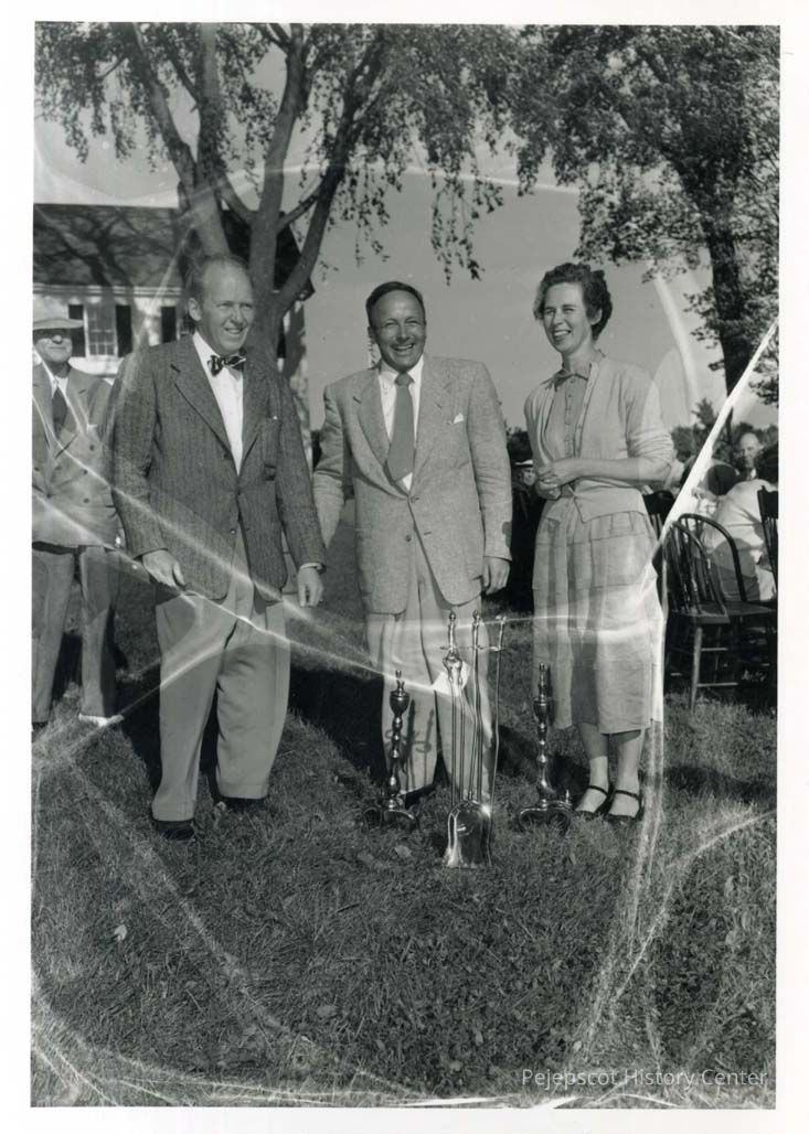Three people face the camera at the Rotary Club picnic.Sam Ladd, G. E. Coleman, Jean Coleman.