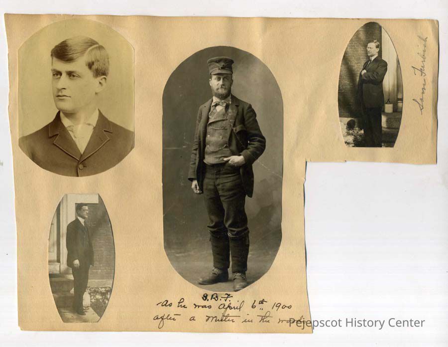 Some B/W photos of Samuel B. Furbish pasted onto an irregular cut piece of paper. 1900