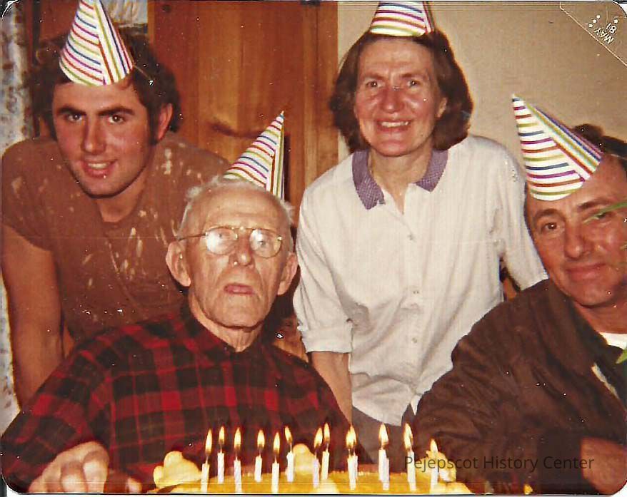 A color photograph of Samuel Holbrook and three unidentified people all wearing birthday hats. Undated