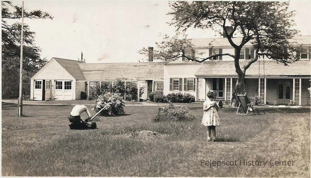 A B/W photograph of Samuel S. Holbrook working on his lawn mower while a little girl plays with her kitten. 6/1940