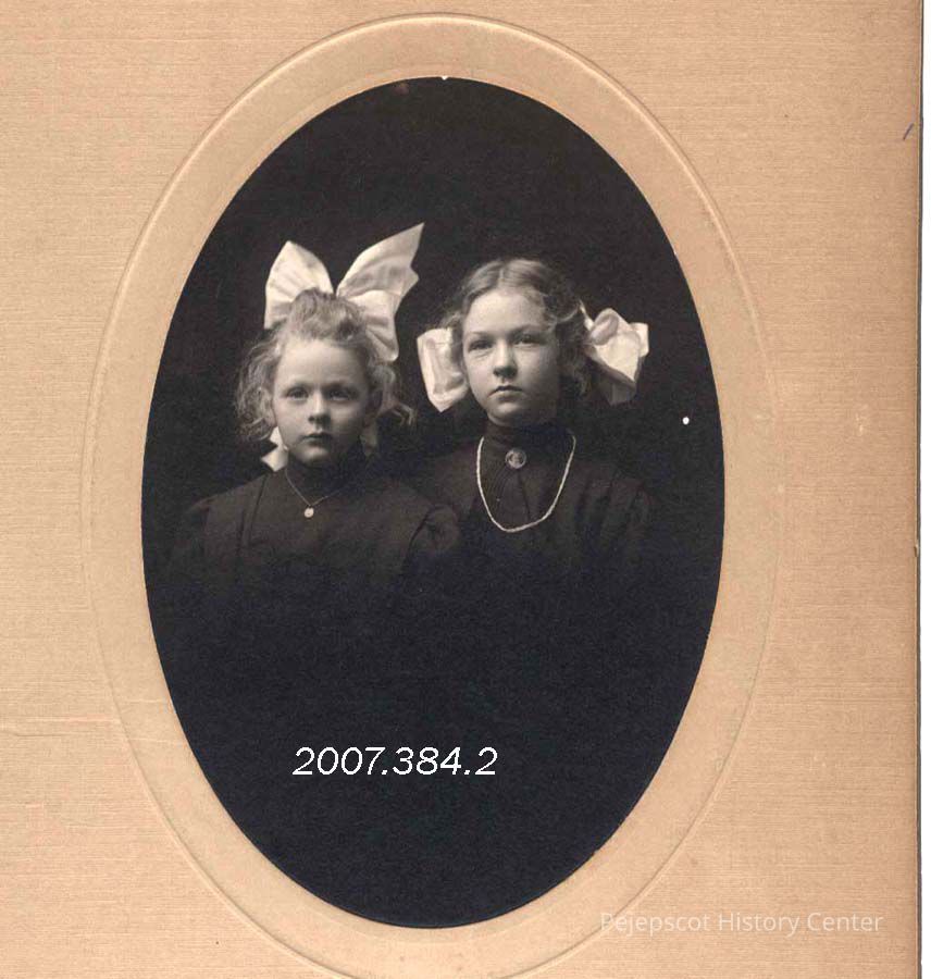 A B/W oval shaped photograph of Sarah and Martha Wheeler. Sarah Wheeler eventually became Mrs. Emerson Zeitler. Undated