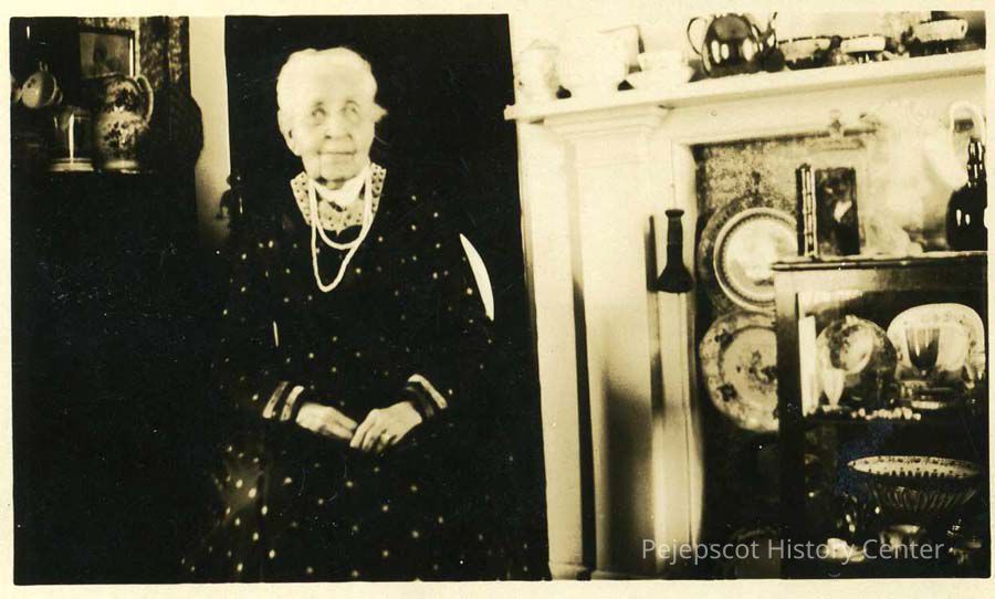 An undated B/W photo of Miss Sarah Quinnam at her home at 44 Harpswell Street, Brunswick, Maine.