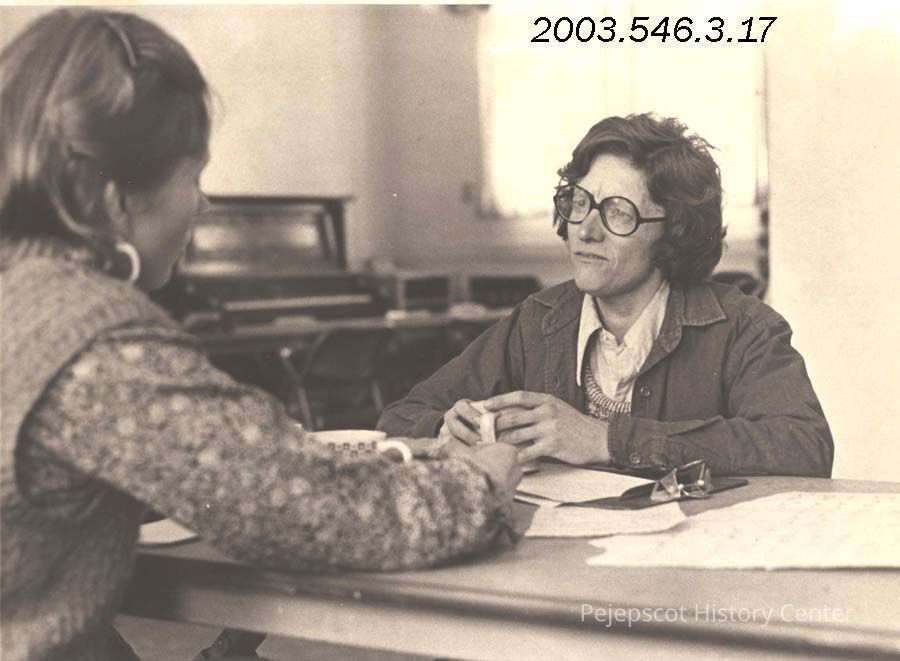 Nan Stone, right, who ran the Women's Counseling Service in Topsham, talks with Sarah Wyman, a registered nurse at Penobscot Bay Medical Center who attended a seminar for professionals.The black and white photograph was taken by The Times Record in Brunswick, Maine, in January 1979.Collection
