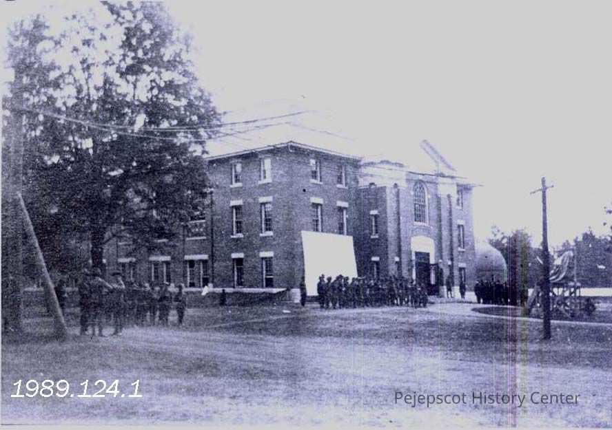 Sargent's Gym at Bowdoin College. It was used as an observatory during World War I. This image shows groups of men in uniform in front of the building.