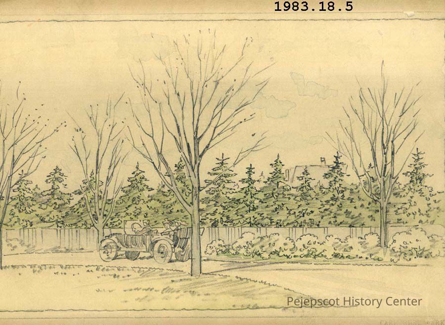 A colored pencil scene near the railroad station. It shows two people in an automobile. It is marked: "Carl Rust Parker, Landscape Architect, Portland, Maine". See accession paper work for a biography.Collection