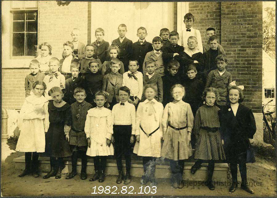 A B/W photograph of a group of school children standing in front of the Bath Street school.