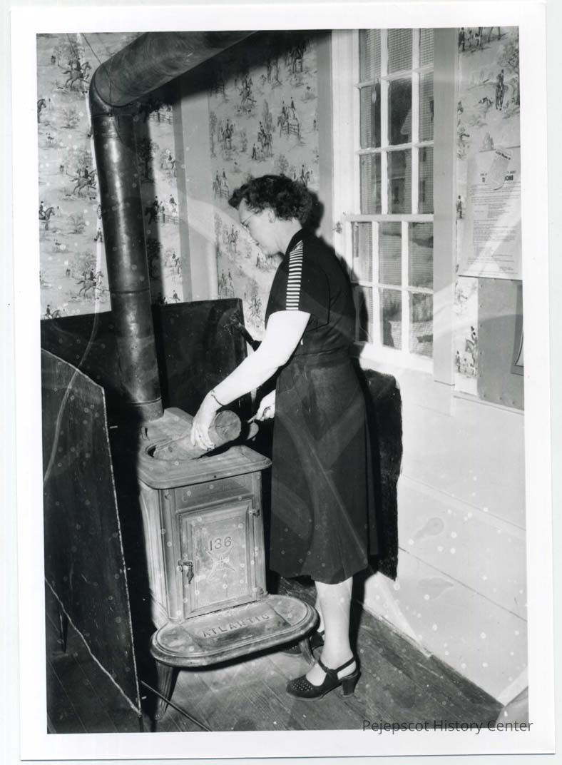 A woman puts a stick of wood in a small stove at either Growstown or Bunganuc School.
