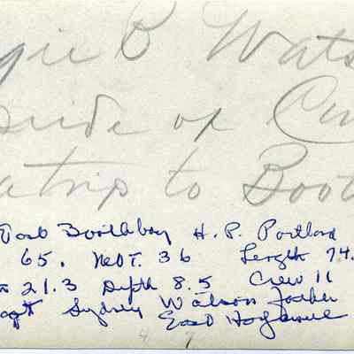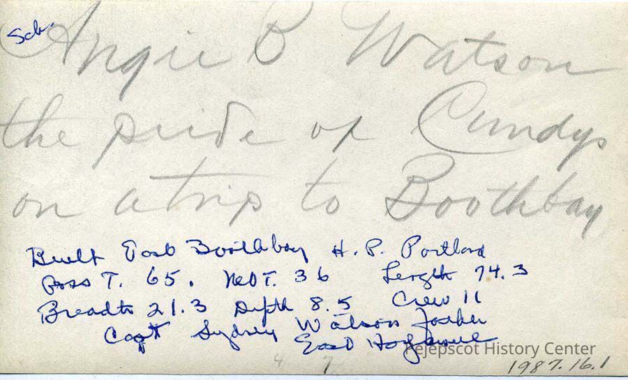 An undated sepia-toned photo of the schooner the Angie B. Watson, "pride of Cundy's", on a trip to Boothbay, Maine. Her specs are given on the back as follows: built in East Boothbay by H.P. Portland, Gross T. = 65, Net T. = 36, Length = 74.3, Breadth = 21.3, Depth = 8.5, Crew = 11. Captain Sydney Watson, father, East Harpswell, Maine.Lexicon
