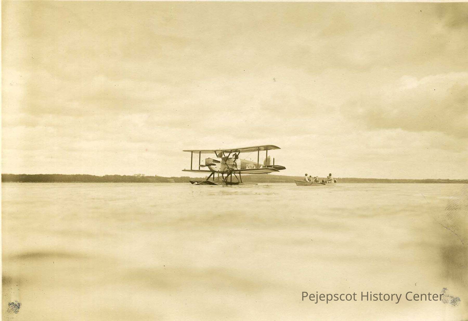 A sepia toned photo of the sea plane "New Orleans" flown by Lt. Nelson, one of the Around the World Flyers, at Mere Point in Brunswick.